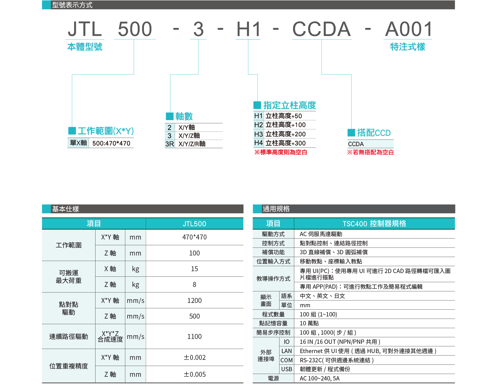 工作範圍X*Y軸 (mm):470*470 工作範圍Z軸(mm):100 可搬運最大荷重X軸(kg):15 可搬運最大荷重Z軸(kg):8 點對點驅動X*Y軸(mm/s):1200 點對點驅動Z軸(mm/s):500 連續路徑驅動X*Y*Z合成速度(mm/s):1100 位置重覆精度X*Y軸(mm):±0.005 位置重覆精度Z軸 (mm):±0.005
