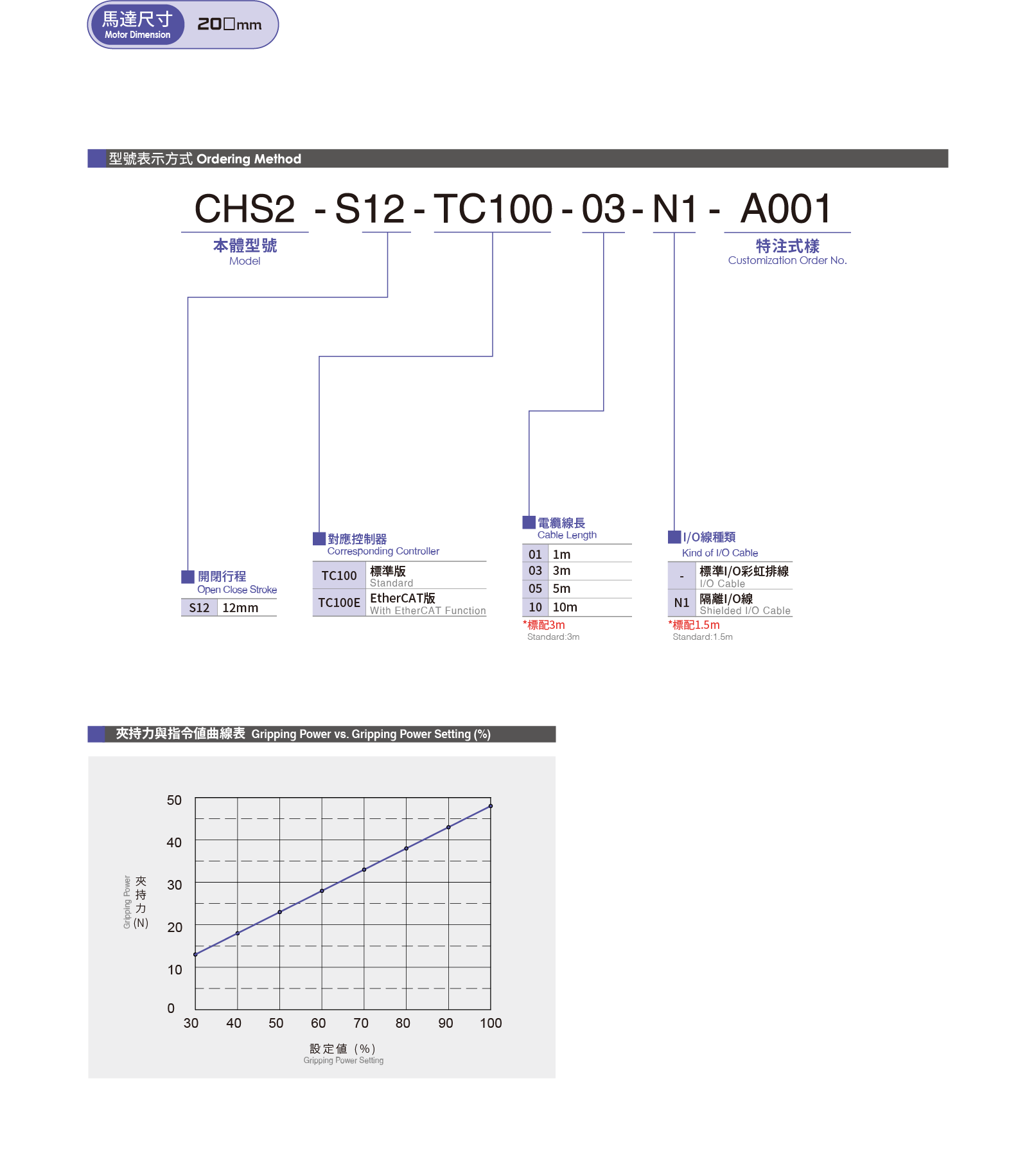 夾持重量:0.22(kg) 夾持力範圍:6.5~22(15-100%)(N) 開閉行程:12(mm) 開閉速度:10-70(mm/s) 位置重複精度:±0.01(mm) 導引機構:線性滑軌 使用溫度範圍:0~+40(˚C) 使用濕度範圍:RH90以下(無結露)(%)