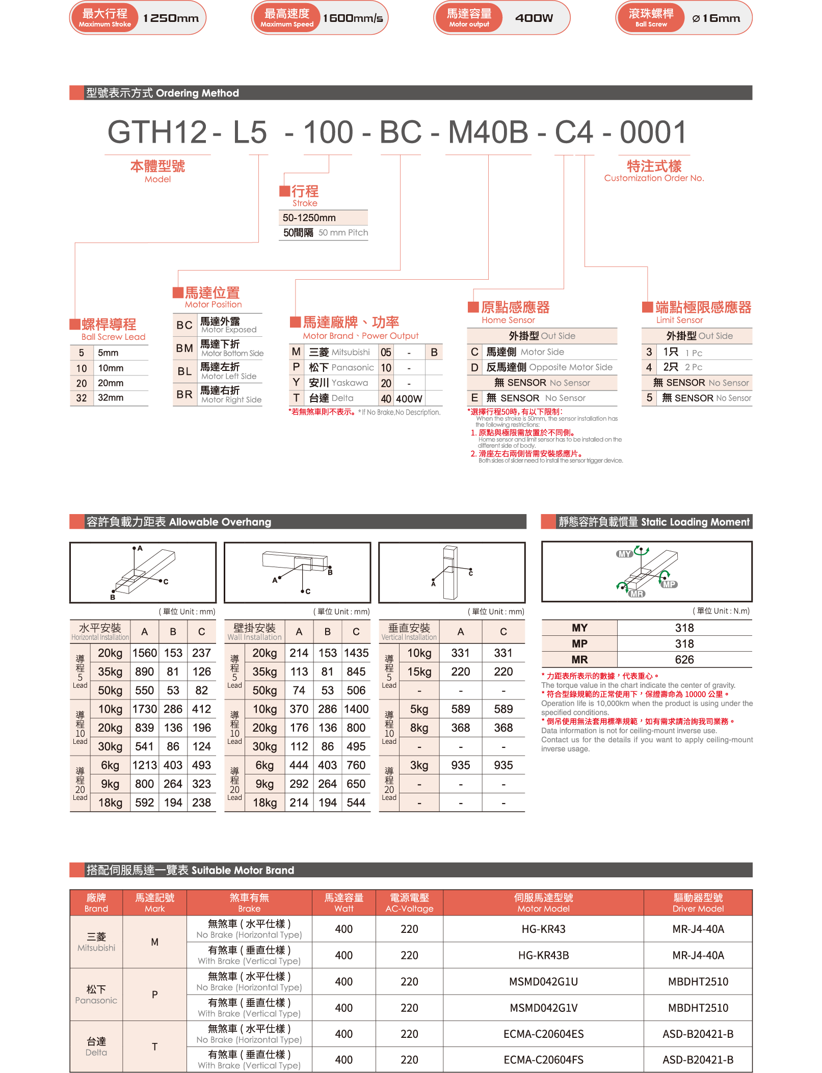 位置重覆精度:±0.005(mm) 螺桿導程:5/10/20/32(mm) 最高速度:250/500/1000/1600(mm/s) 最大可搬重量 水平使用:110/88/40/30(kg) 最大可搬重量 垂直使用:33/22/10/8(kg) 定格推力:1388/694/347/218(N) 標準行程:50-1250 / 50(mm) *行程超過800時,會產生螺桿偏擺,此時請將速度調降。 *馬達加減速設訂0.2秒。