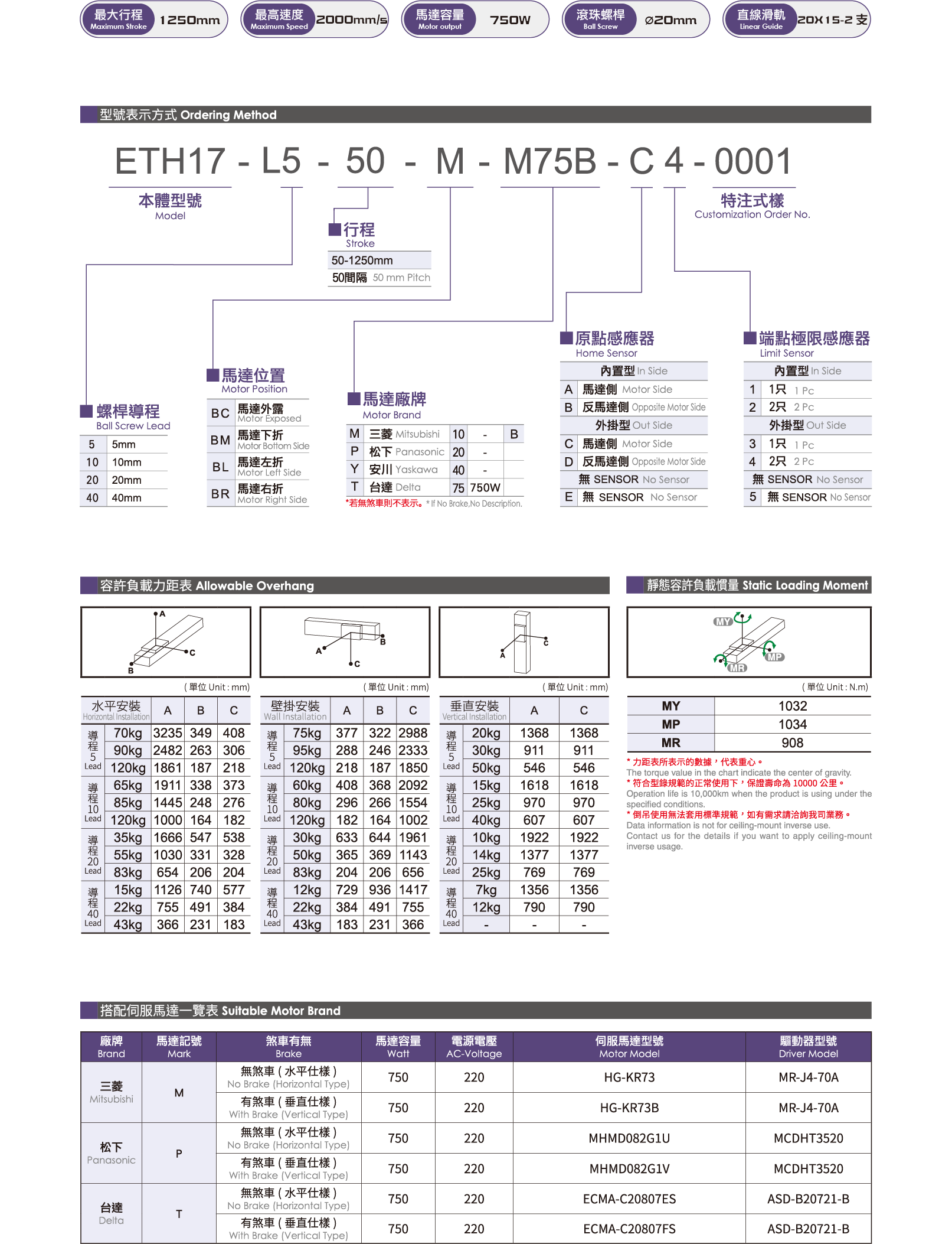 位置重覆精度:±0.005(mm) 螺桿導程:5/10/20/40(mm) 最高速度:250/500/1000/2000(mm/s) 最大可搬重量 水平使用:120/120/83/43(kg) 最大可搬重量 垂直使用:50/40/25/12(kg) 定格推力:2563/1281/640/320(N) 標準行程:50-1250 / 50(mm) *行程超過850時,會產生螺桿偏擺,此時請將速度調降。 *馬達加減速設訂0.2秒。